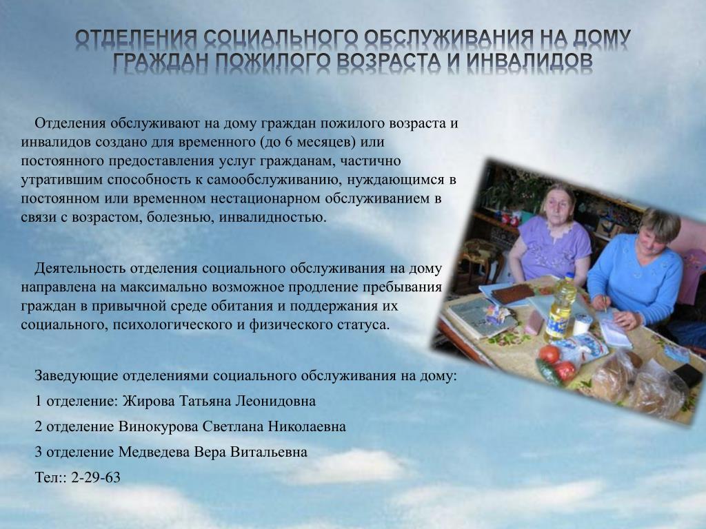 - нормативной документации по организации социально-бытового обслуживания пожилых людей и инвалидов на дому;