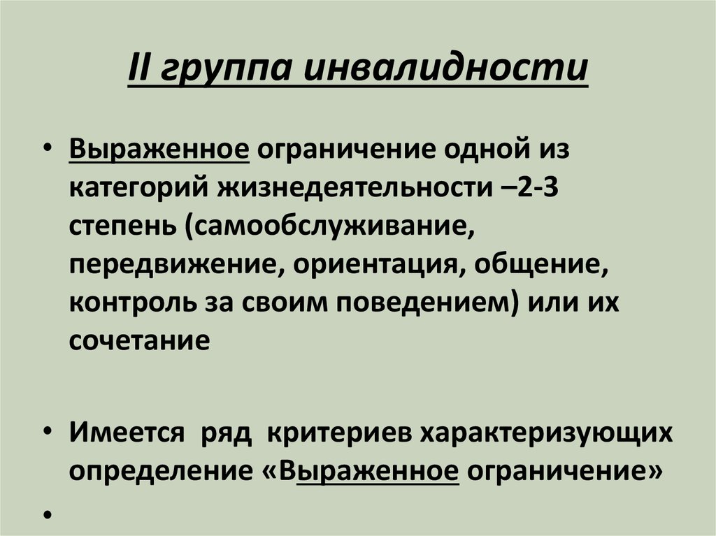 Также эта группа инвалидности может быть присвоена лицам, абсолютно не способным к самостоятельному передвижению из-за врожденных или приобретенных заболеваний, ориентации в пространстве, общению и самоконтролю. Трудиться такие люди, как правило, не могут.