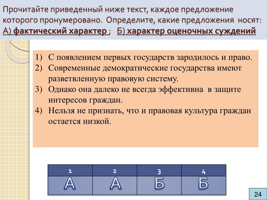 (А) С появлением первых государств зародилось и право. (Б) Современные демократические государства имеют разветвленную правовую систему. (В) Однако она далеко не всегда эффективна в защите интересов граждан. (Г) Нельзя не признать, что и правовая культура населения остается низкой.