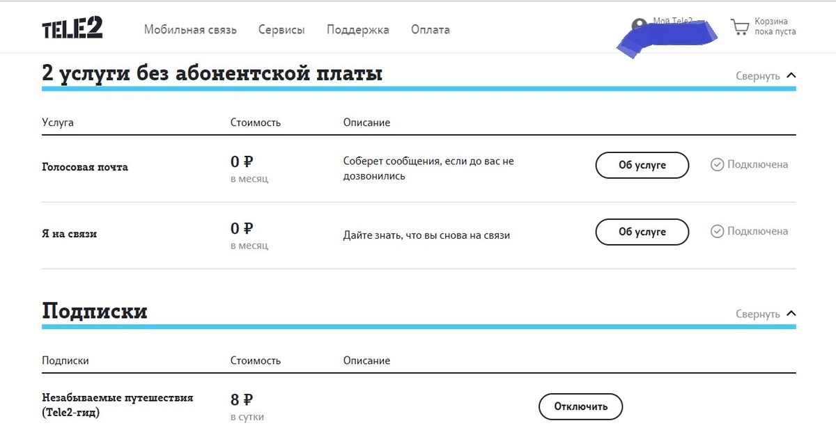 Ознакомьтесь со списком доступных и подключенных ранее услугах и, при необходимости, отключите все ненужные услуги Теле2. За отключение услуг плата не взимается.