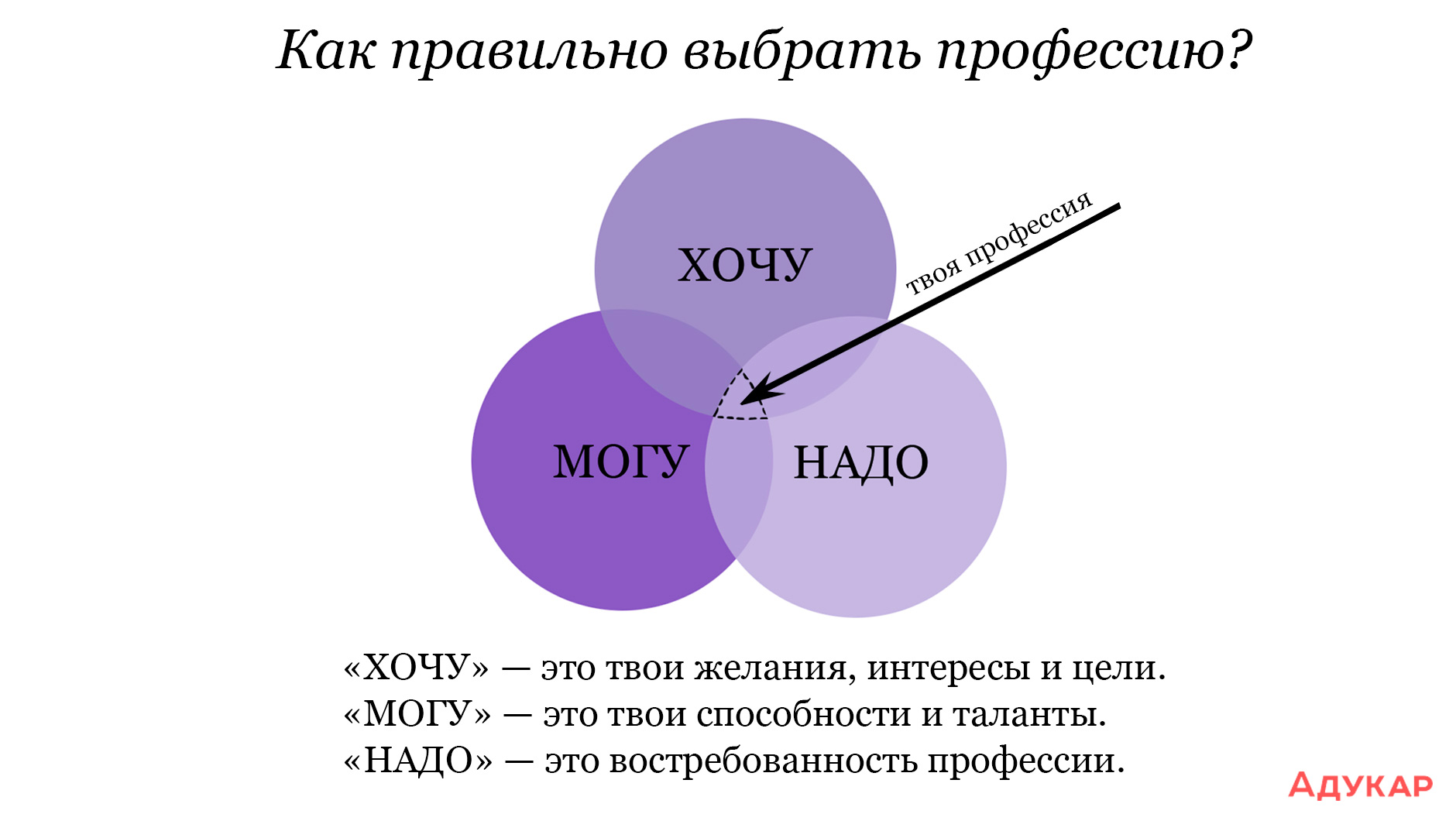 Подумайте, какие у вас склонности, какое дело вызывает у вас любовь. Я, например, вспоминаю себя в школе. У меня особенно ни к чему конкретно склонности не было, но мне нравились гуманитарные предметы, мне нравились естественные предметы. Поэтому я стала журналистом. Еще мне нравилась психология, читал разные книжки. Даже думала поступать на психолога. В итоге я журналист и немножко психолог для друзей.