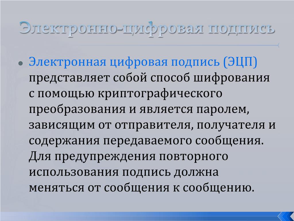Электронная подпись — это реквизит электронного документа, подтверждающий её принадлежность автору и фиксирующий любые изменения, внесённые в документ после его подписания. Федеральный закон №63-ФЗ «Об электронной подписи» от 06.04.2011 г. определяет её как совокупность цифровой информации, присоединённой к электронному документу и подтверждающей его подлинность.