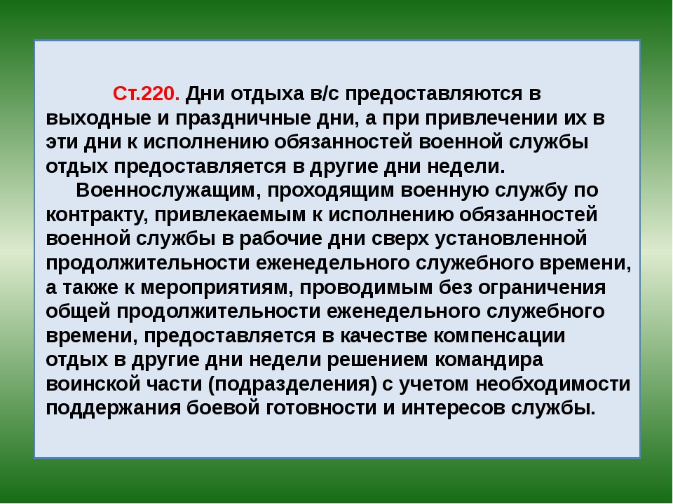 Дни отдыха предоставляются военнослужащим в выходные и праздничные дни, а при привлечении их в эти дни к исполнению обязанностей военной службы отдых предоставляется в другие дни недели.