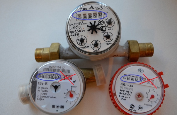 Для расчета потребленного количества воды показания необходимо снимать отдельно по каждому прибору учета по всем черным цифрам и первой цифре после запятой / значению на первом круговом циферблате. Цифры до запятой (черные) показывают количество израсходованной воды в местрах кубических (м3), значения последних цифр (красные) или показания на круговых циферблатах (в зависимости от типа счетчика) – литры израсходованной воды (1м