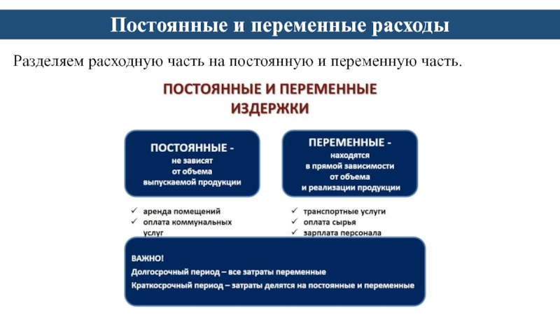 | Возникают, когда | Даже если выпуск равен нулю, возникают постоянные затраты. | Затраты увеличиваются / уменьшаются в зависимости от результата |