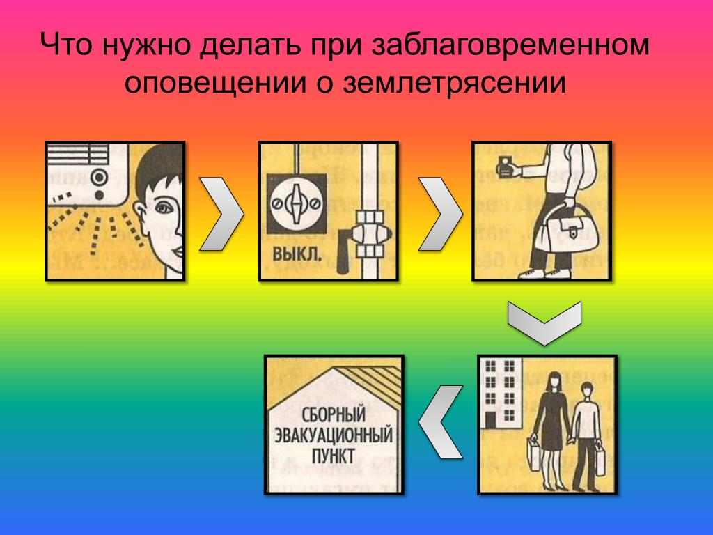 В случае оповещения об угрозе землетрясения или появления признаков его необходимо действовать быстро, но спокойно, уверенно и без паники.При заблаговременном оповещении об угрозе землетрясения, прежде чем покинуть квартиру (дом) , необходимо выключить нагревательные приборы и газ, если топилась печь — затушить ее; затем нужно одеть детей, стариков и одеться самим, взять необходимые вещи, небольшой запас продуктов питания, медикаменты, документы и выйти на улицу. На улице следует как можно быстрее отойти от зданий и сооружений в направлении площадей, скверов, широких улиц, спортивных площадок, незастроенных участков, строго соблюдая установленный общественный порядок. Если землетрясение началось неожиданно, когда собраться и выйти из квартиры (дома) не представляется возможным, необходимо занять место (встать) в дверном или оконном проеме; как только стихнут первые толчки землетрясения, следует быстро выйти на улицу.На предприятиях и в учреждениях во время землетрясения все работы прекращаются, производственное и технологическое оборудование останавливается, принимаются меры к отключению тока, снижению давления воздуха, кислорода, пара, воды, газа и т.
