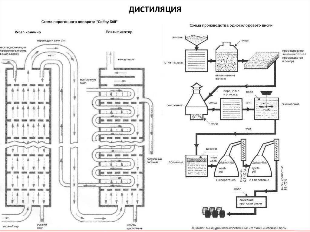 Большинство виски, производимых в перегонных кубах, подвергается либо двойной, либо тройной дистилляции.Каждый раз, когда виски нагревают, конденсируют и собирают, мы называем это перегонкой. Сделайте это дважды и назовите это двойной дистилляцией. Сделайте это три раза… вы поняли идею. Первая дистилляция отделяет спирт, а также другие вещества с более низкой температурой кипения в сброженной жидкости, находящиеся на дне так называемого браги (на этом этапе ферментированная жидкость на самом деле называется «брагом»). Спирт испаряется. при 173 ° F, поэтому собранная жидкость также будет более крепкой.Содержимое будет пениться и пузыриться, вытягивая из жидкости всевозможные молекулы и пары. Полученный дистиллят называется «слабым вином», его отводят и снова перегоняют в «спиртовом перегонном кубе», чтобы увеличить крепость алкоголя, а также усилить вкус.