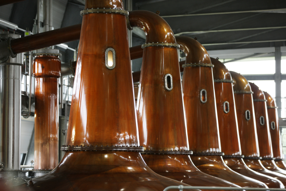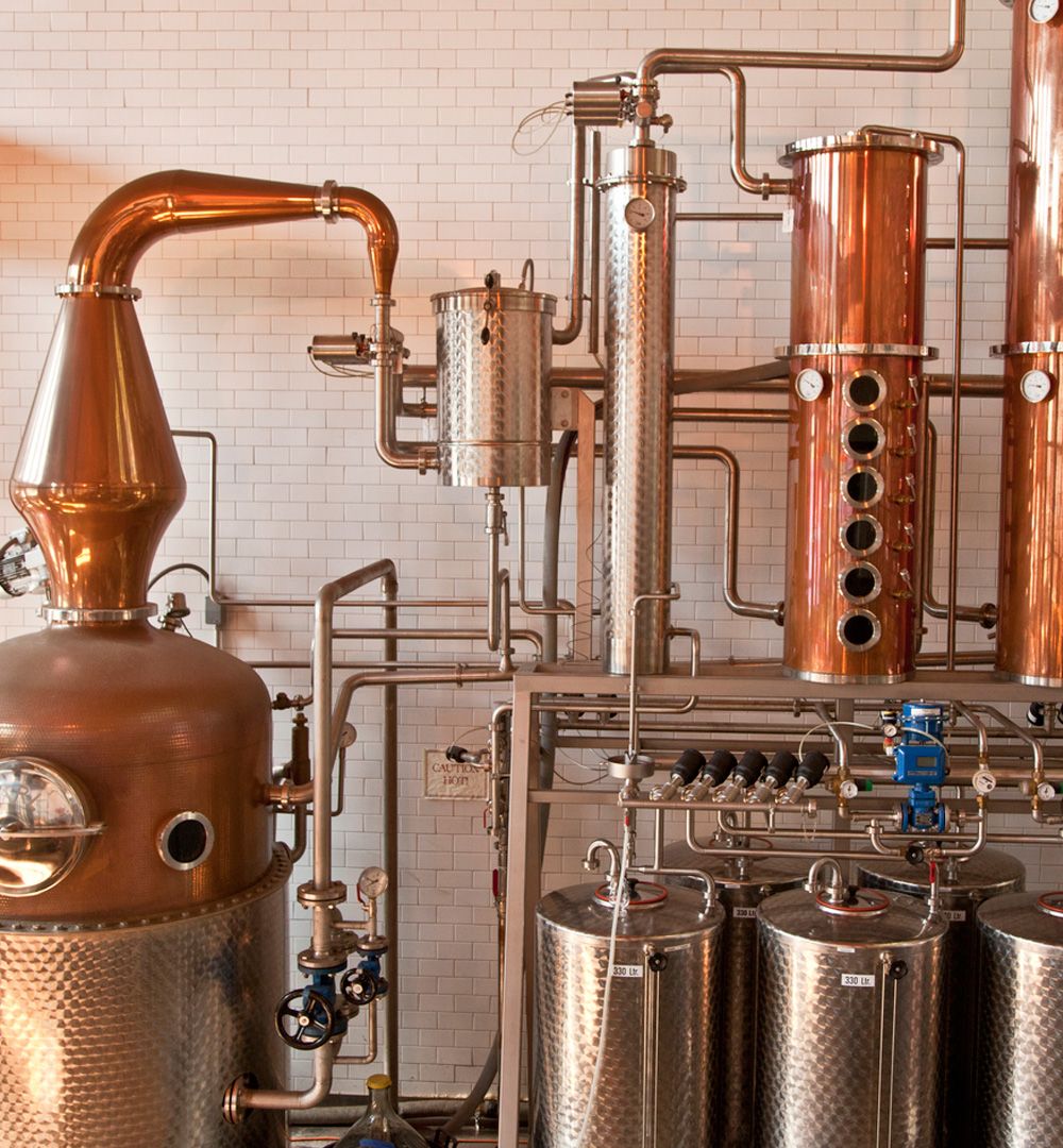 Перегонные кубы изготовлены из меди, материала, который взаимодействует с молекулами для улучшения профиля дистиллята, особенно с соединениями серы, образующимися при метаболизме дрожжей во время ферментации.