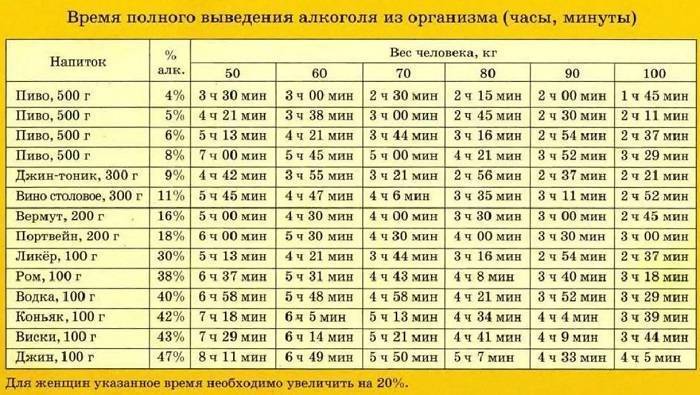Из этой таблицы видно, через сколько времени выходит алкоголь из крови и когда человек возвращается в форму