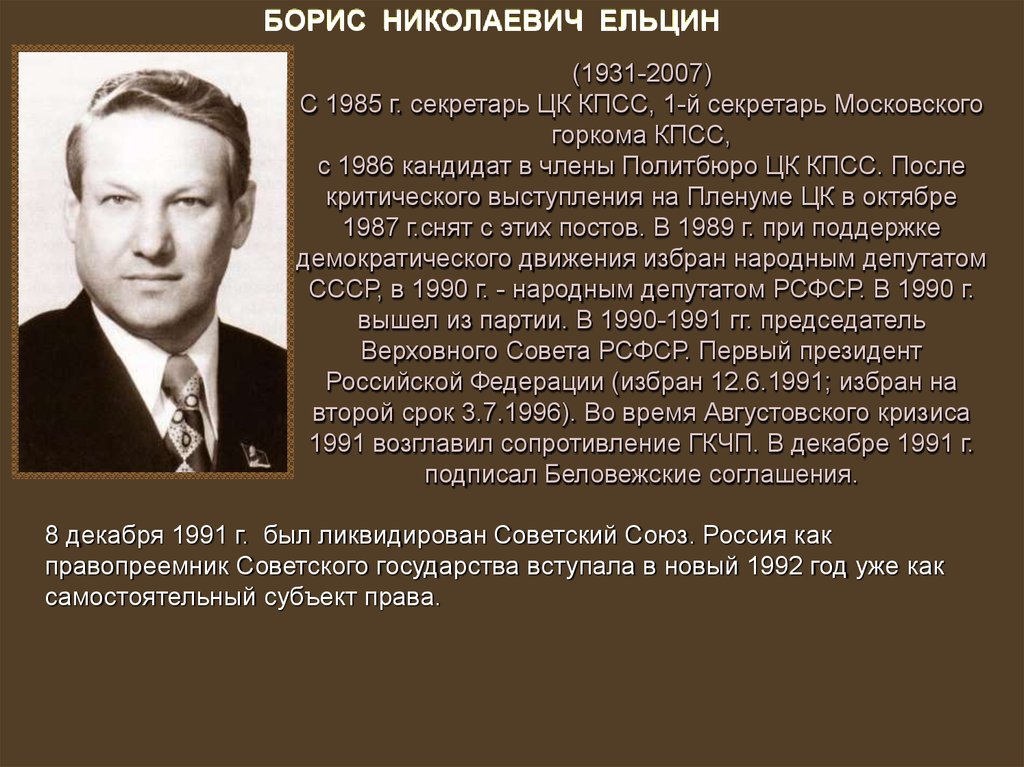 8 декабря 1991 года Б. Н. Ельцин совместно с Л. М. Кравчуком и С. С. Шушкевичем подписал Беловежское соглашение глав Белоруссии, России и Украины о ликвидации СССР и образовании Содружества Независимых Государств (СНГ).