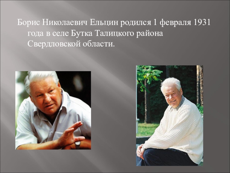 Борис Николаевич Ельцин родился 1 февраля 1931 года в селе Бутка (ударение на последнем слоге) Талицкого района Свердловской области. Отец – Николай Игнатьевич, строитель, мама – Клавдия Васильевна, портниха. В период коллективизации дед Б. Н. Ельцина был сослан, отец и дядя также подверглись незаконным репрессиям (оба прошли через исправительно-трудовой лагерь). В 1935 году семья переехала в Пермскую область на строительство Березниковского калийного комбината.