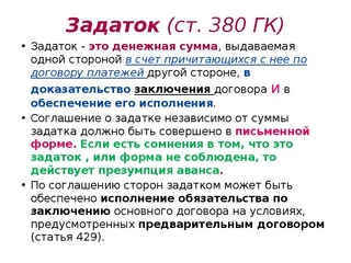 1. Задатком признается денежная сумма, выдаваемая одной из договаривающихся сторон в счет причитающихся с нее по договору платежей другой стороне, в доказательство заключения договора и в обеспечение его исполнения.