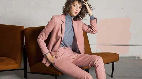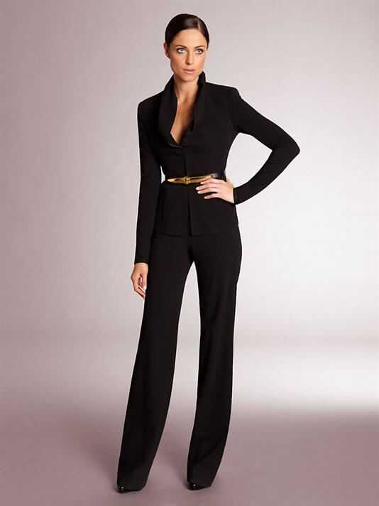 Брючный костюм, похожий на мужской, ввела в моду перед Второй мировой Марлен Дитрих. Он поразил современниц, но несмотря на то, что начавшаяся Вторая мировая война заставила многих женщин надеть брюки, этот образ воспринимался как слишком эпатажный и в женский деловой стиль вплоть до 70-х годов 20 века совершенно не вписывался. Лишь внедрение джинсов и других брюк в повседневную жизнь женщин сделали этот предмет одежды более привычным, повседневным, брюки перестали восприниматься как что-то неприемлемое и Ив-Сен Лоран смог предложить брючный костюм в качестве альтернативы традиционному женскому деловому костюму. С тех пор строгий жакет и расклешенные к низу брюки стал достойной альтернативой пиджаку и узкой прямой юбке в качестве деловой одежды для женщин. Достигший своей кульминации в 80-е года костюм с элементами мужского кроя от Джорджо Армани выглядел строго и элегантно.