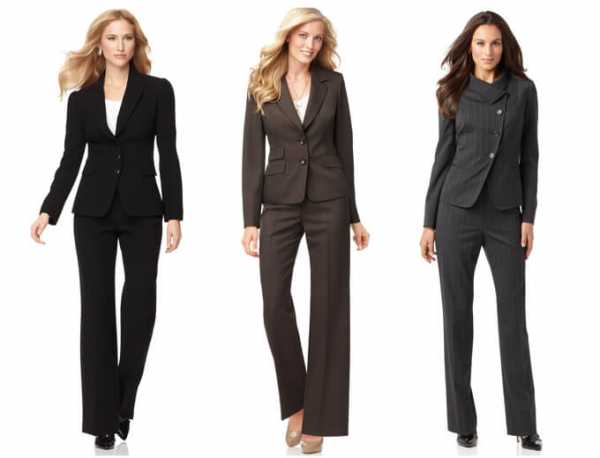 В женской моде фасоны этих частей костюма могут изменяться в зависимости от моды или особенностей фигуры. Так, пиджак может быть длинным или коротким, двубортным или однобортным, юбка – карандаш или годе, брюки широкими или зауженными, но без избыточных деталей, с практичной фурнитурой.