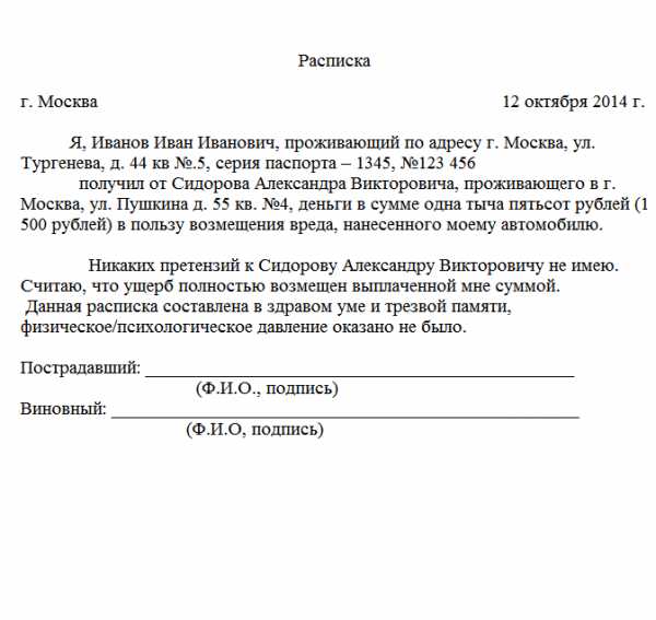 виновная сторона или сроки, по которым она обязуется осуществить это действие. В расписке денежные средства вписываются в цифровом виде и прописью, и указывается валюта расчёта; - Потерпевшая сторона собственноручно должна написать, что после получения средств претензий не имеет.