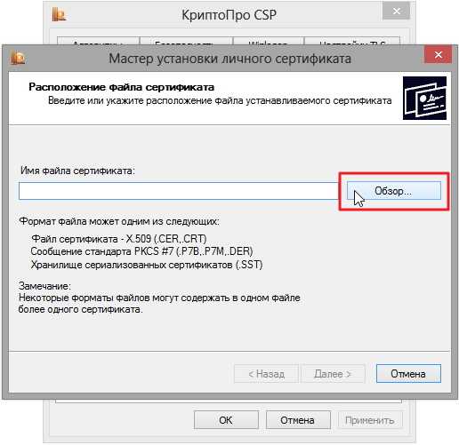 2. В окне “Мастер установки личного сертификата” нажмите на кнопку “Далее”. В следующем окне, чтобы выбрать файл сертификата, нажмите “Обзор”.