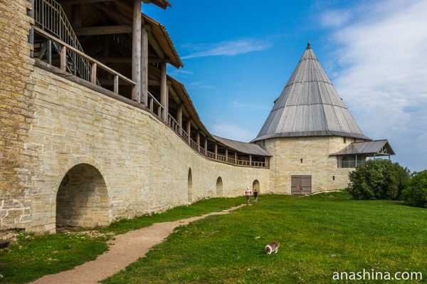 В одном из переходов крепости… Слабая половина нашей компании недоумевает, как в этих маленьких проходиках перемещались рослые защитники крепости (в памяти ещё свежи два богатыря с первой фотографии, олицетворяющие князя Рюрика и Вещего Олега).