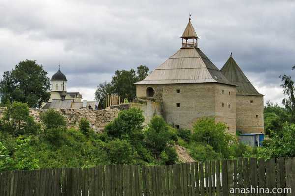 С площадки позади «Рюрика и Олега» открываются классические фотографические виды на крепость в Старой Ладоге. Единственно, в полной мере насладиться историческим духом прошлого не дают огороды местных жителей, навязчиво попадающие в кадр…
