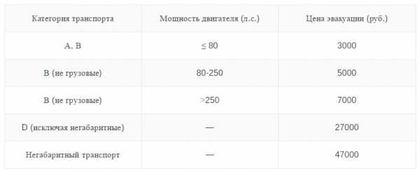 Стоимость услуг рассчитывают на основе мощности двигателя и категории автомобиля, который эвакуируют. Для Москвы действуют такие расценки: