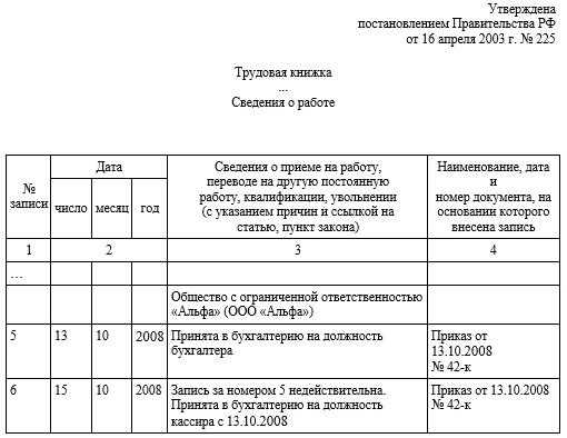 Помните: сведения о трудовой деятельности не зачеркивают ни при каких обстоятельствах! Здесь порядок такой же, как и описывалось выше – записать сведения о недействительности предыдущей записи, зафиксировав ее номер, и затем вносить новую достоверную запись под своим порядковым номером.