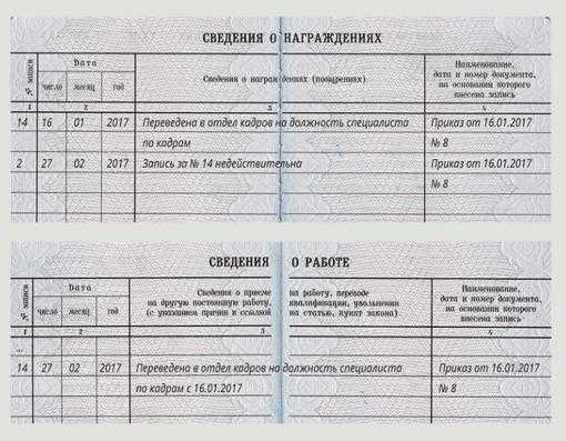 Ошибочной считается любая формулировка, содержащая некорректную информацию: неправильную дату, не соответствующее штатному расписанию наименование должности работника или название организации. Если запись отражает кадровое решение, впоследствии признанное недействительным — не обойтись без исправления в трудовой книжке: трудовые книжки сотрудников, восстановленных на работе после незаконного увольнения, подвергаются этой процедуре в обязательном порядке. В последний раздел («Сведения о награждении») вносится информация о полученных сотрудником наградах, поощрениях и почетных званиях.