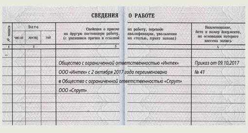 В раздел трудовой книжки, посвященный трудовой деятельности сотрудника, обязательно вносятся записи о переименовании или реорганизации работодателя. Такие перемены фиксируются в графе 3, без указания номера и даты записи. Основанием для переименования или смены организационно-правовой формы компании служит приказ по предприятию, номер и дата которого вносится в трудовую книжку.