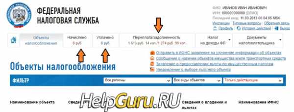 После активации личного кабинета, сайт идентифицирует пользователя как налогоплательщика и покажет актуальную и достоверную информацию о состоянии его налоговых обязательств. Это будет отражено в верхней части страницы в виде таблицы: начислено, уплачено, переплата.