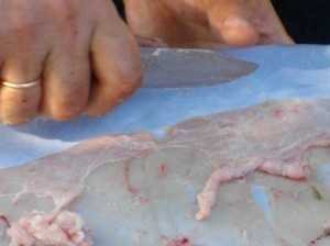 Соскребание жира и пленки осуществляется стальным ножом либо железной щеткой. Двигаться нужно со стороны хвостовой части в сторону головы и со стороны хребтины к области живота.