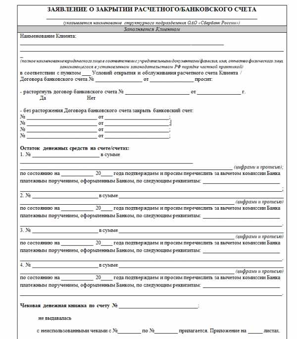 Бланк заявления на закрытие расчетного счета в Сбербанке
