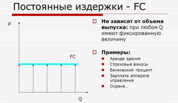 Этот эффект не обратно пропорционален объему производства. Например, рост объема производства может потребовать увеличение численности бухгалтерии и торгового отдела. Поэтому часто говорят об условно постоянных расходах. К постоянным затратам относятся также расходы на управленческий персонал, обслуживание основного производственного персонала (уборка, охрана, прачечная и др.), организацию производства (связь, реклама, банковские расходы, командировочные расходы и др.), а также амортизационные отчисления. Постоянные расходы — это расходы, например, на аренду помещений, а цена аренды может меняться в связи с изменением рыночных условий. Постоянные затраты включают в себя и некоторые налоги. Это, например, единый налог на вмененный доход (ЕНВД) и налог на имущество. Суммы этих налогов могут меняться в связи с изменениями ставок таких налогов. Размер постоянных расходов может быть рассчитан по формуле: