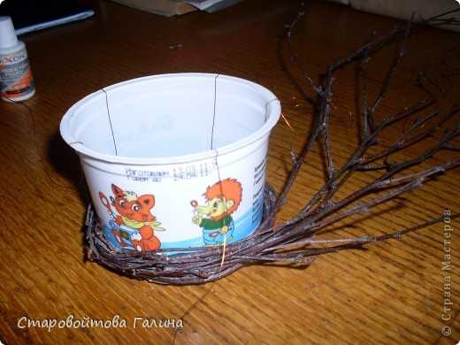 Постепенно добавляются новые веточки и так до верха.Получается что мы, как-будто, пришиваем веточки к баночке.С помощью шила делаю отверстия ,для продевания проволоки. Веточки доставала из-под снега,с дерева не срывала.Был сильный ветер их было много на земле.Если вдруг веточки подсохли, я их замачиваю в горячей воде на пару часов.