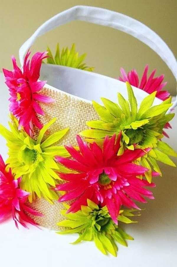 Чтобы сделать оригинальную и красивую пасхальную корзину своими руками, найдите подходящую по размерам основу (цветочный горшок, маленькое декоративное ведро, посуду и т.д.) и обклейте ее поверхность тканью, а затем приделайте прочную ручку из проволоки, жгутов или других подходящих материалов. В дополнение украсьте свою корзинку искусственными или живыми цветами, листочками деревьев, бантами, рюшами и т.д.