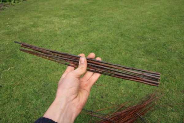 Сначала я очищаю их от листьев и мелких веточек. Легче они обрываются, если проводить рукой сверху вниз, а не наоборот. Самые толстые я использую для основы (каркаса) – нарезаю секатором стебли одинаковой, нужной мне высоты. Втыкаю их вертикально или по конусу через каждые 20-25 см по окружности.