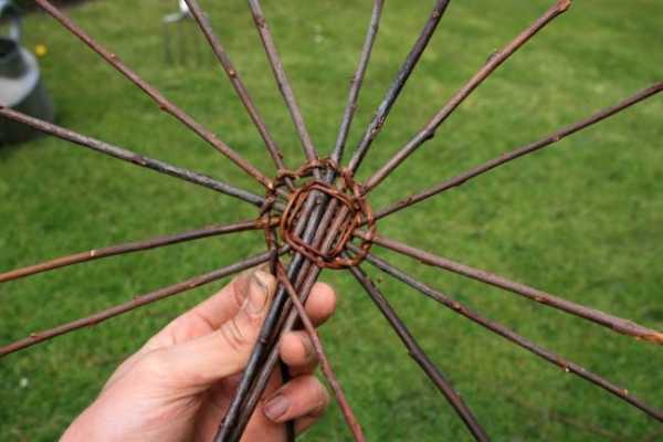 8. Когда дно корзинки достигло нужного вам размера, поднимаем «грани звезды» вверх. Это как раз тот момент, когда хорошо иметь четыре руки. Для удобства можно завязать верхушки веток ниткой или лентой.