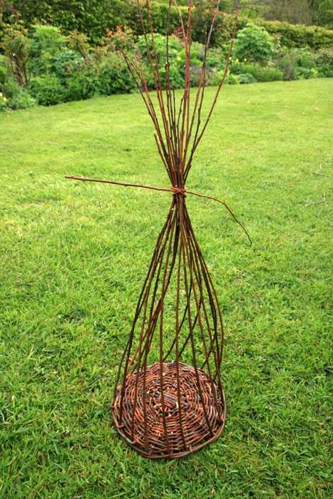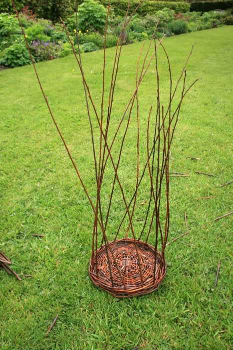 Затем стебли плотно переплетаю, укладывая горизонтально одну за другой. Так меня мама учила штопать носки. Наверху изгибаю дугой по окружности еще несколько веток для окантовки, и клумба готова. Рекомендую приниматься за изготовление сразу после срезки стеблей, пока они пропитаны влагой. Иначе они могут ломаться, а нам надо, чтобы они гнулись, создавая круглую форму клумбы.