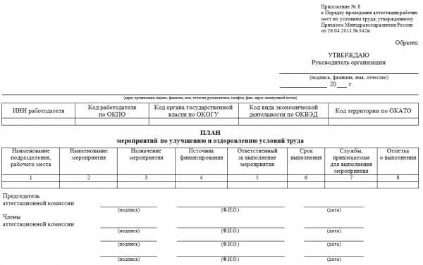 Составляется план на конкретный год с отражением расчётных сроков на проведение каждого из пунктов. В нём обязательно фиксируются фамилии и должности тех сотрудников, которые отвечают за отдельные этапы. Утверждается такой план коллективным договором или соглашением по охране труда, принимаемым в качестве приложения к нему.