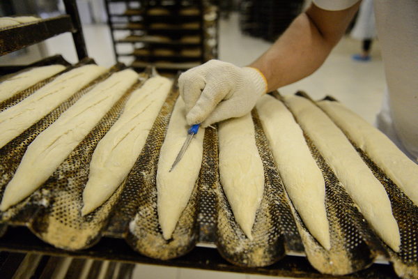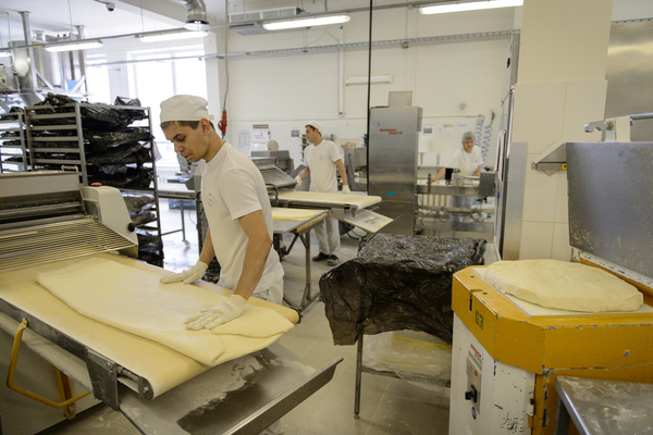 Готовое тесто из большого котла выливают на разделочные линии, их три: хлебная, с бесстрессовым давлением (для сохранения пузырьков, что важно, например, для изготовления чиабатты) и кенинг (для мелкой выпечки, булочек и круассанов). После того, как машина разделила тесто на равные куски, подключается ручной труд: сотрудники придают форму хлебу вручную. Затем хлеб отправляют в расстойные шкафы и дают ему немного отлежаться. В «Буше» вообще пропагандируют принцип неспешности, например, не используют никаких химических добавок и улучшителей для того, чтобы тесто быстрее поднялось или скорее заварилось.