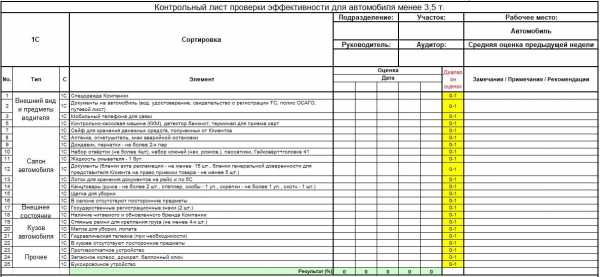 Система организации и рационализации рабочего места 5S предполагает описание и контроль за исполнением первых трех пунктов: сортировка, порядок и чистота. Периодически начальство делает контрольный обход, и все данные по рабочим местам заносит в контрольный лист: