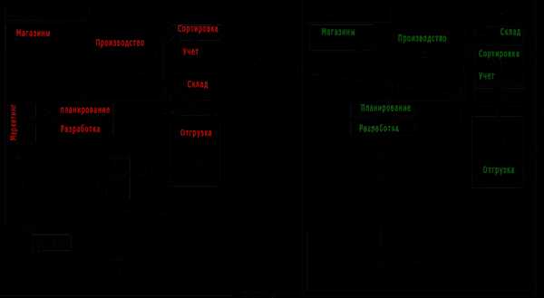 На диаграмме видно, что до изменений товар проходил гораздо более длинный путь, чем после расположения отделов и склада по пути следования товара из цеха. Соответственно, это сокращает время на логистику.