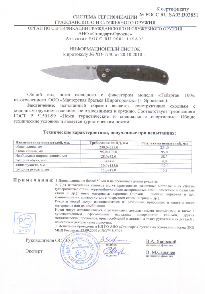 требуйте и сертификат. Наши серьезные производители обязательно сертифицируют свои ножи, известные зарубежные марки тоже имеют россиские сертификаты.