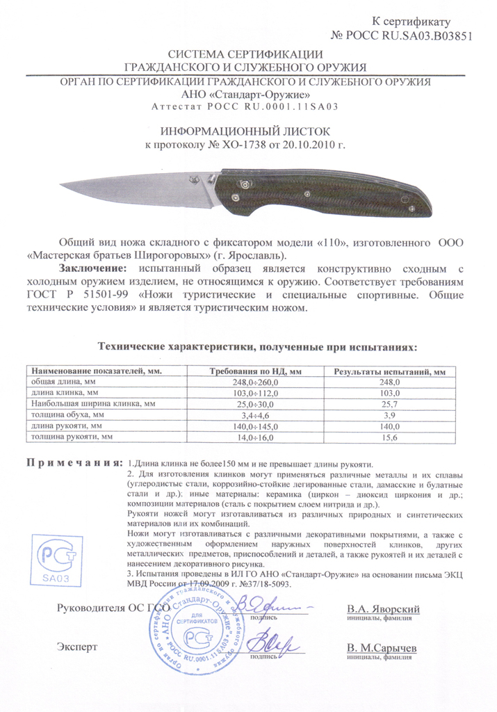 Ну и другу, которому я подарю нож Широгорова с сертификатом, будет интересно руководствуясь чем эксперт выдал сертификат. Оно, конечно, понятно, чем в России эксперты руководствуются, но хочется верить что какое-то отношение к закону сертификат все-же имеет.