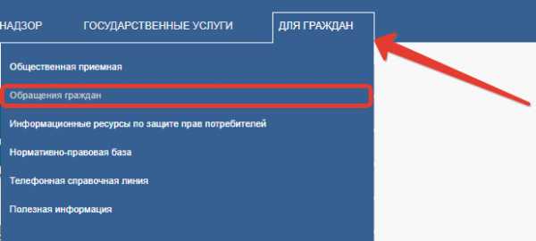 - На сайте Роспотребнадзора навести курсор на вкладку «Для граждан» и в выпадающем списке выбрать «Обращения граждан»;